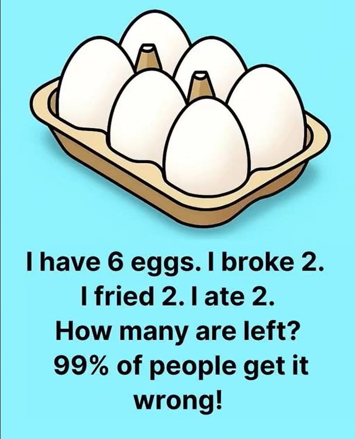 At first glance, the image presents a simple puzzle:“I have 6 eggs. I broke 2. I fried 2. I ate 2. How many are left?”Yet, it’s this very simplicity that tricks most people. Let’s unpack it. The Common Mistake Many people instinctively subtract each action from the total:6 eggs – 2 broken – 2 fried … Read more